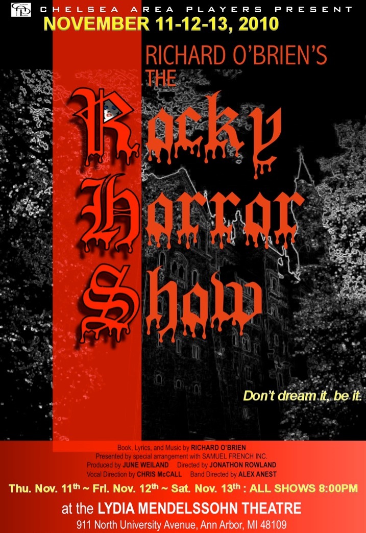 While driving home during a rain filled night, straight-laced lovebirds Brad and Janet end up at the castle of Dr. Frank-N-Furter and his strange and bizarre entourage. They find him having a party. This is no ordinary party, no ordinary night. This is the unveiling of the Dr.'s latest creation....Rocky, a man-made Adonis. The long running British stage musical that became an international sensation since it’s 1973 inception, this exceedingly grand visual and musical camp satire of the golden days of the B-movie horror and science-fiction genres is a must see. Complete with the expected "audience participation" of sass from the audience, cascading toilet paper thrown, and an array of other audience participation props, this deliberately kitschy Rock 'n' Roll sci-fi gothic stage treat is more fun than ever.